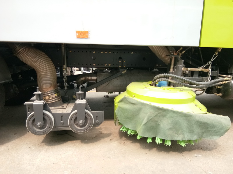 2)采用“中置两立扫+真空吸尘罩+中置宽吸嘴+左右四吸尘管”的布置方式。大扫刷设计,可清除道路台阶死角垃圾,吸嘴能随地面状况自动找平,清扫能力大,清扫速度快。